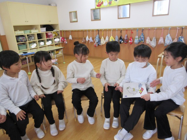 うめ、たんぽぽ組では、2チームに分かれて単語を言いながらできるだけ早く回すゲームをしました。