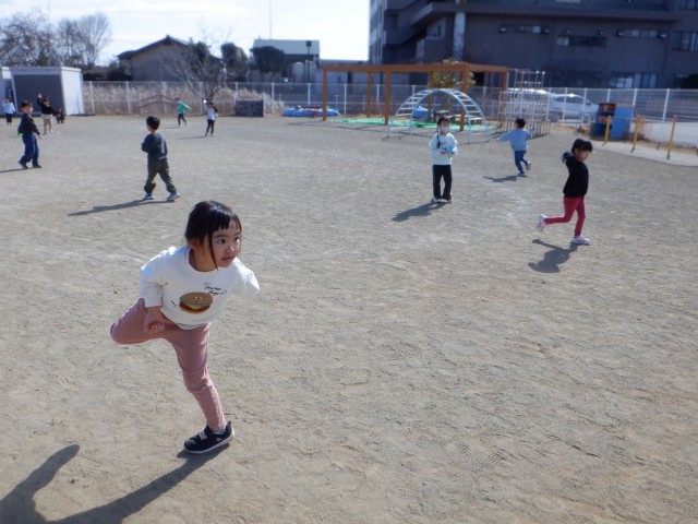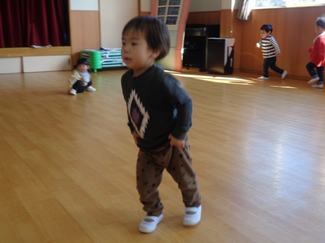 次に、マラソンやハイハイ、ワニさん歩きをしたあと、今日は、初めてけんけんぱに挑戦しました。片足でジャンプするのが難しかった様子で、皆苦戦していました!