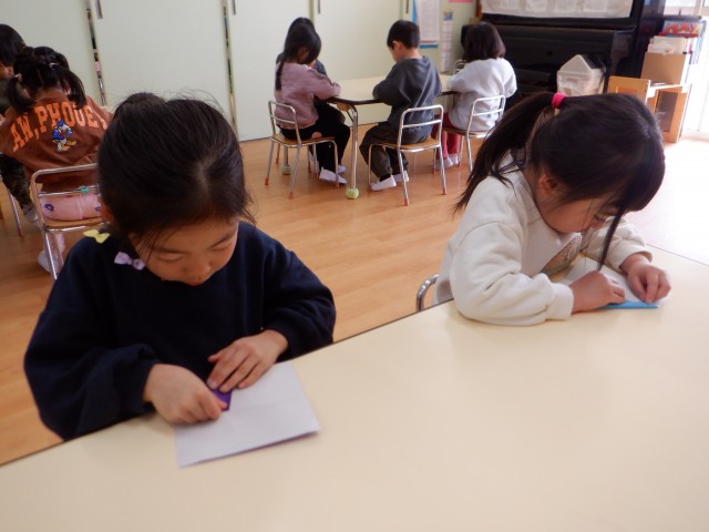 角と角を合わせたり、よく折り目をつけたりすることを意識しながら行いました。集中して折るこどもたちで、「白いところ見えないように折った‼」と得意げに見せてくれました。