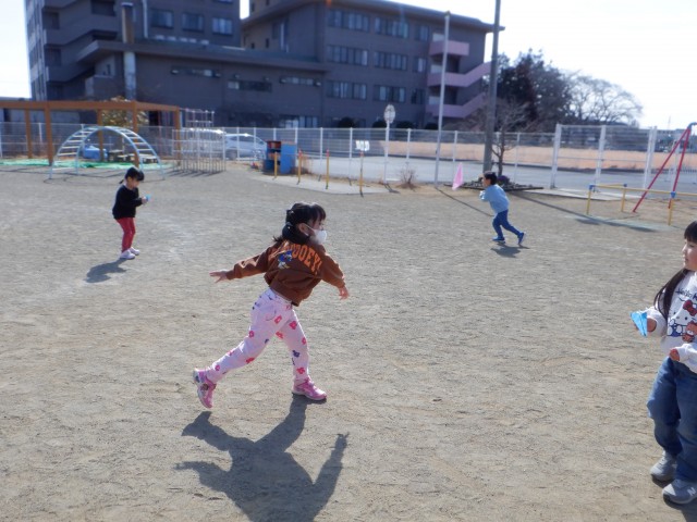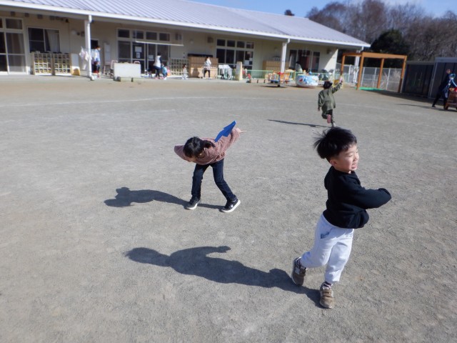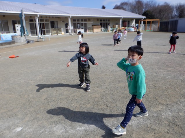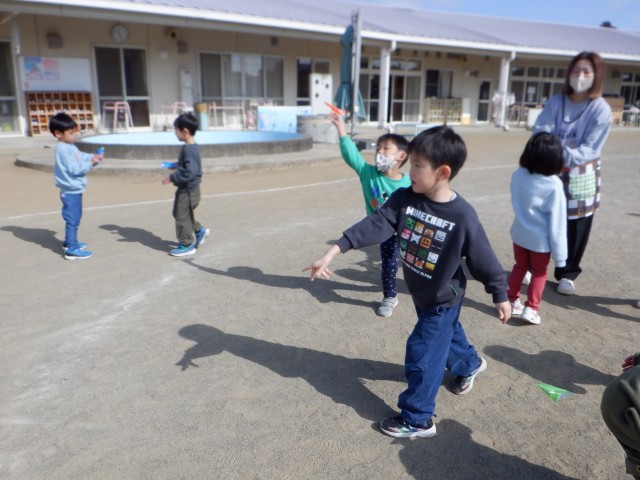 完成後は、外に行き飛ばしてみました。「遠くに飛ばす‼」と勢いよく手を振りかざすので、、、紙飛行機は地面に落下、、、。飛ばすことに苦戦していましたが何度も練習していくうちに遠くに飛ばせるようになる子が沢山いました。