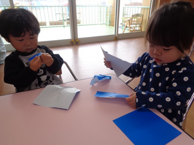 折り紙の色を見てクイズをしました。「あお!」「むらさき!」と難しい色も分かるようになっていて、微笑ましかったです☺