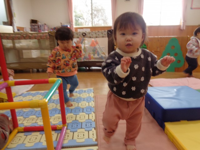 月齢の低い子は、ベビージムの玩具を手で揺らして遊ぶ様子が見られるようになりました。