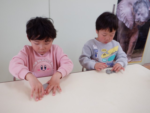 3月6日のお別れ遠足についての話をしました。保護者の方がいない遠足は、初めてなので約束事などの話をすると真剣な表情で聞いていました。赤チーム、白チームに分かれて遠足で行なう予定のゲームなどをして遊びました。「猛獣狩りにいこうよ」のゲームは、盛り上がり、文字数を数えて友達と集まることができました!