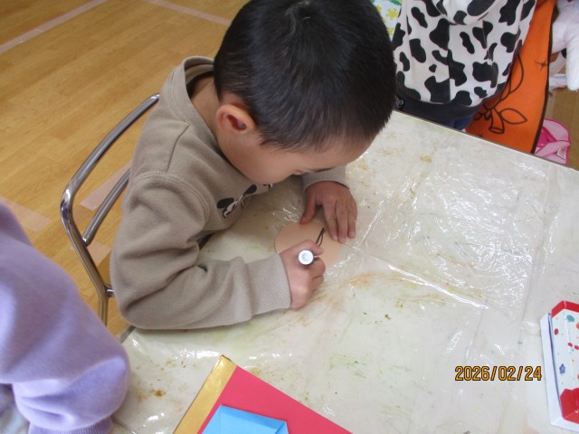 「目はここだよね‼」「口は赤で描くよ♪」と一つ一つのパーツを確認しながら行っていました。髪の毛を描くのは初めてでしたが、見本を見ながら丁寧に描くことができました。どのお雛様・お内裏様も可愛らしい表情に仕上がりました。お部屋に飾るのが楽しみです!