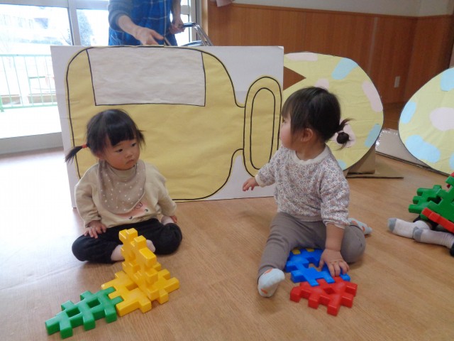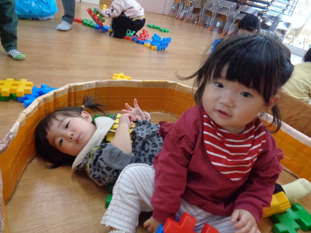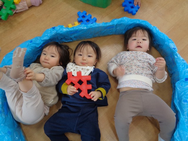 発表会の時の巣の中に皆で入って遊びました。寝転がったり、お友達と巣の中でブロック遊びをしたりして楽しみました。