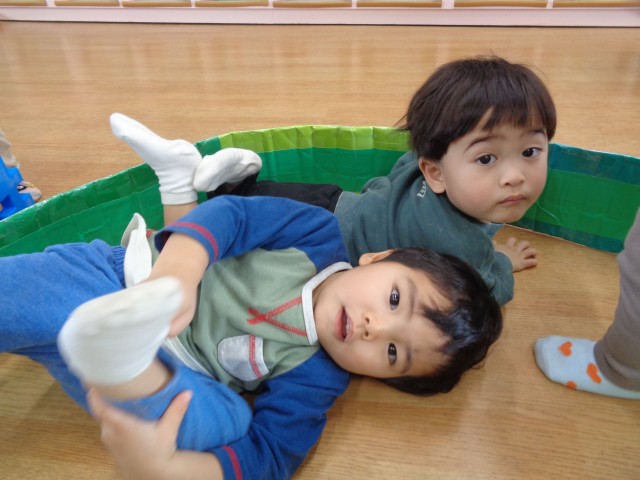 月齢の低い子も、マットの上で皆の様子を見たり、手足を沢山動かして遊びました♪