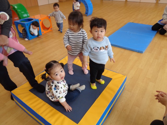トランポリンでは「ぴょんぴょん」と言う保育士の声掛けに一生懸命に屈伸運動をする様子が可愛らしかったです。