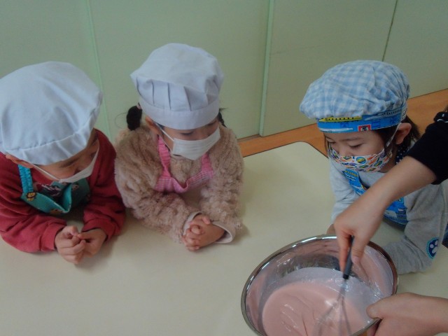 生地作りの様子です。保育士が混ぜている様子をじっと見つめています。