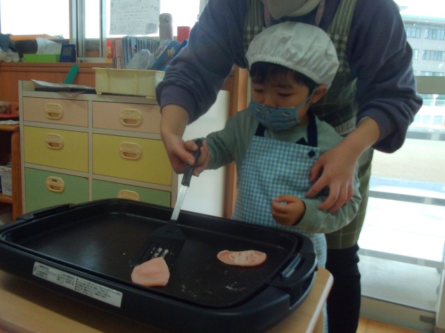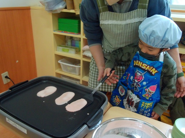 生地をホットプレートで焼きます。保育士と一緒に生地をひっくり返すことに挑戦しました。「失敗しないように頑張らないと!」と意気込んでいましたよ☺