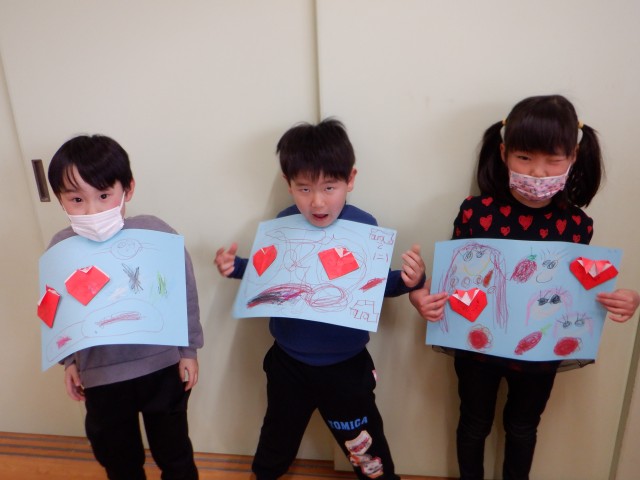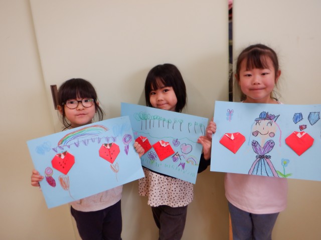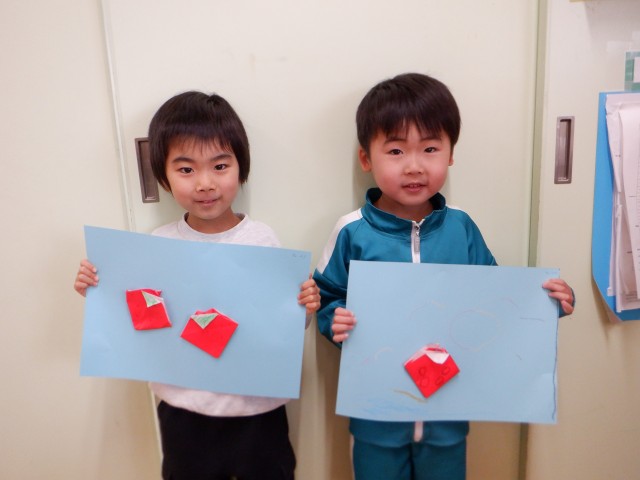 一つ目は、みんなで一緒に、もう一つはそれぞれのペースで折りました。「ここはどうやるんだっけ?」と周りの子に聞きながら作っていました。