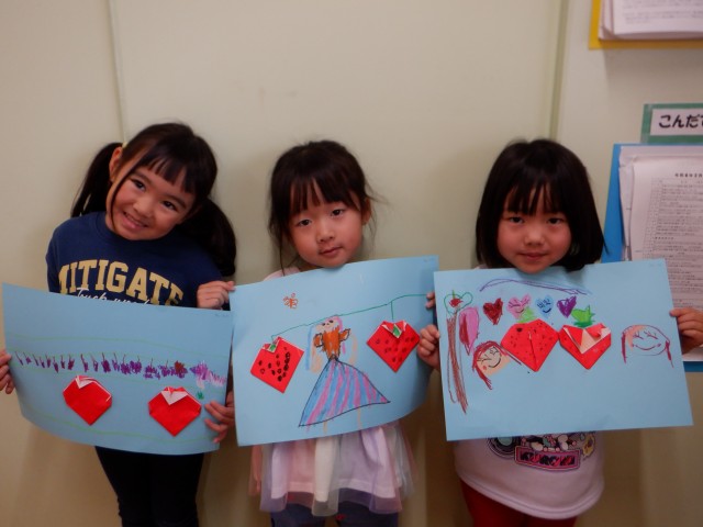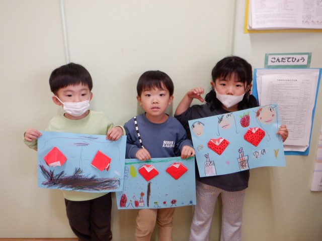 折り紙でいちごを作りました。「いちご狩りしたよ」「朝も食べてきた」などと話しながら作っていました。