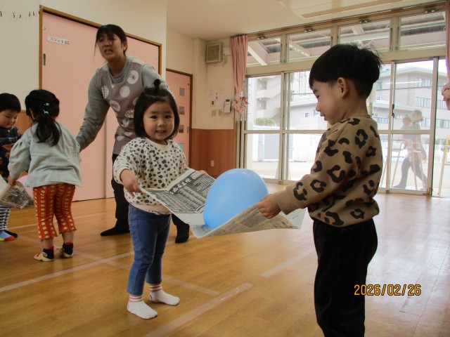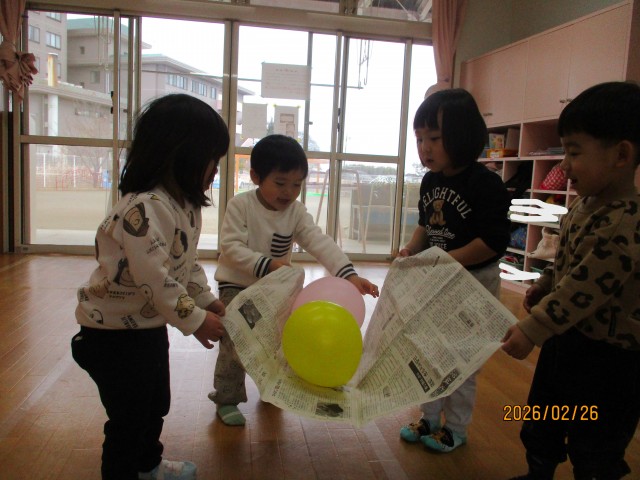 新聞紙を使って、風船運びゲームをしました。