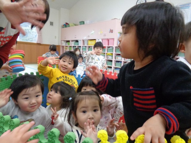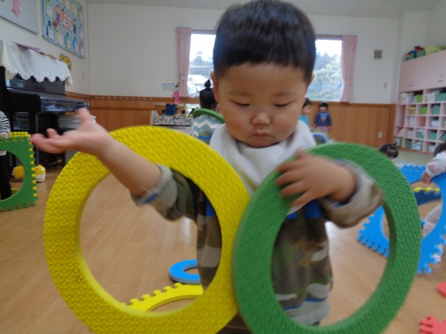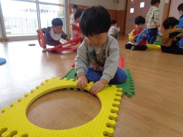 保育士や友達の頭に乗せる子や輪を転がして遊ぶ子がいましたよ♪