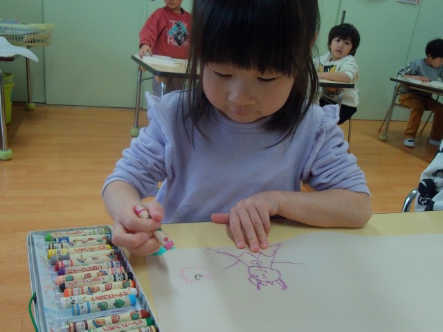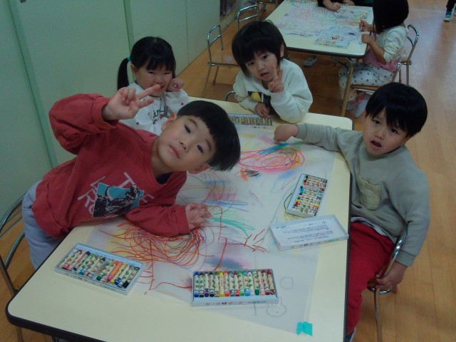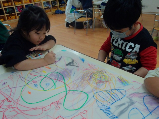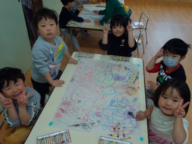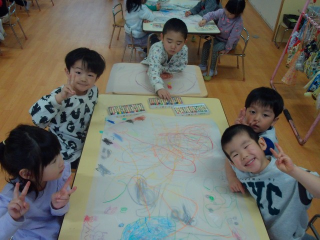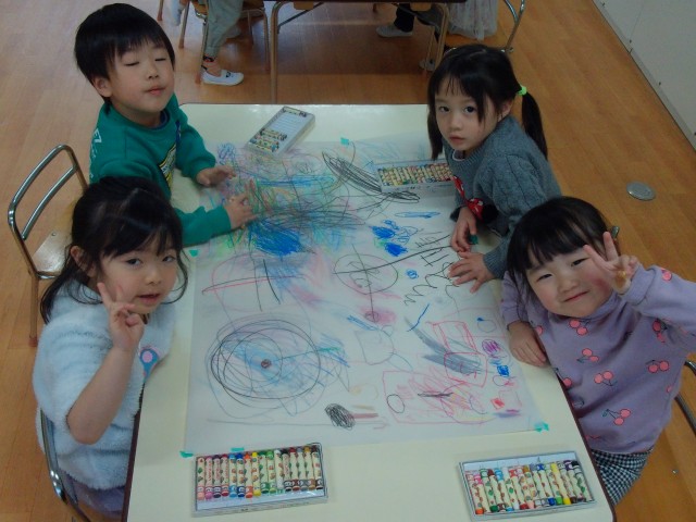 身体測定をした後、大きな紙にクレヨン画をしました。自分のスペースに描く子や紙全体に大きく描く子と様々でした♪皆「これ○○描いたよ」などとお話しながら楽しそうでした。お顔を上手に描いていた子もいて、「これ誰?」と聞くと、「ママ描いた」と教えてくれる子も……。他にもポケモンや桜、プリンセスなど色々なものを描いていました。