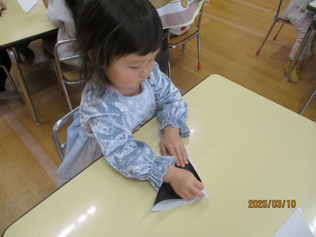折り紙を渡すと自由にハサミで切って模様を作り楽しんでいました。