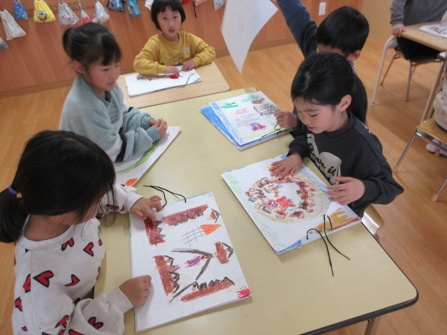 「これ上手でしょ?」「ここ頑張ったんだよね」とお友達同士で話しながら見せ合っていました♪