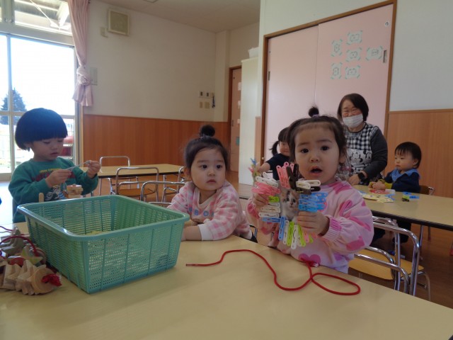 ポットン落とし、紐通し、洗濯ばさみ、ままごと遊びのコーナー遊びをしました。