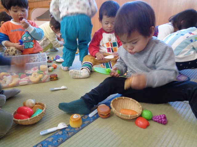 ままごと遊びでは、食べ物を食べる振りをしたり「どうぞ」と保育士や友達とのやりとりをしたりしていましたよ☺