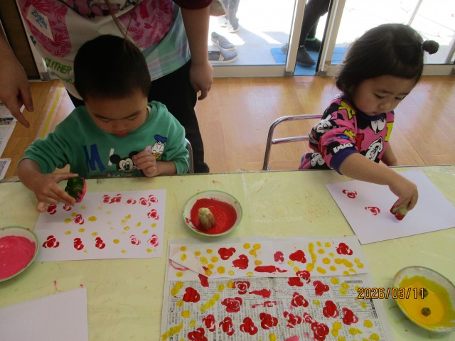 小松菜はバラのような模様に、オクラは星に、ピーマンは花の形になり、繰り返しポンポンと押して楽しむ子どもたちでした!また、スタンプをしている際に、「かわいい!」「きれいだね!」と互いに褒め合う姿も見られ、とても微笑ましかったです☺