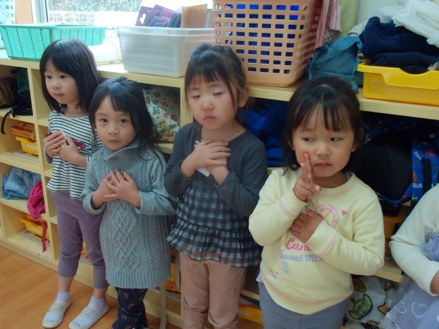 最初にお部屋の紹介をすると、興味津々で保育士の話をじっくりと聞いていました。