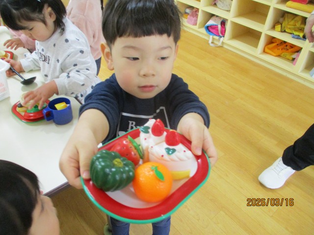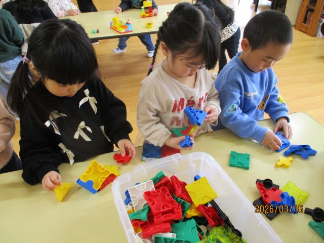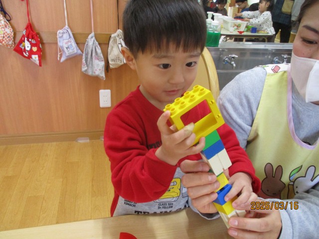4月から使用する保育室に行き、コーナー遊びをしました。