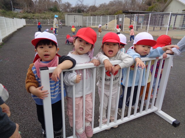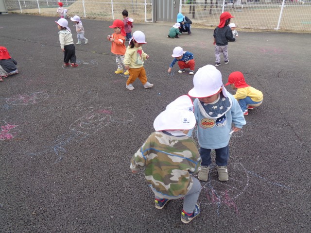 戸外で遊びました。少し肌寒かったので、体操やマラソンをして体を温めました。腕を大きく振って一生懸命走る姿が格好良かったです。「がんばれ~‼」と友達の応援も盛り上がりました。
