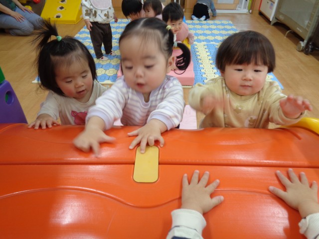 その後、つぼみ組のお部屋に戻り汽車の遊具や坂道マットを使って遊びました。