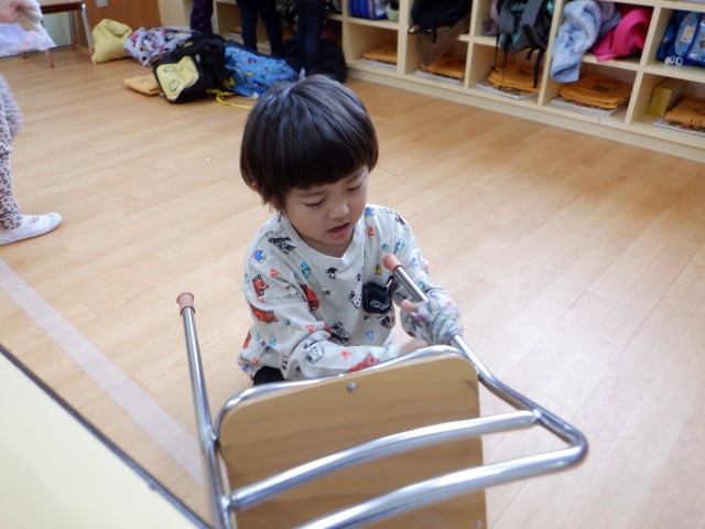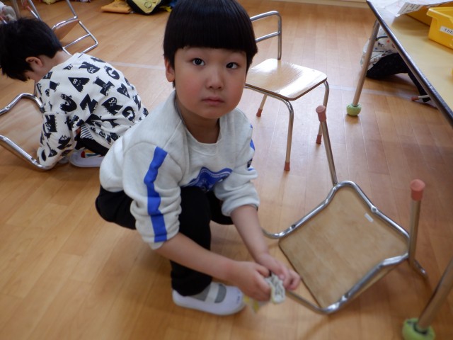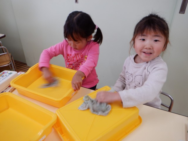 進級に向けて、保育室の清掃をしました。雑巾を一人一枚ずつ配り、ロッカーやお道具箱、椅子や壁、床をきれいに掃除しました。