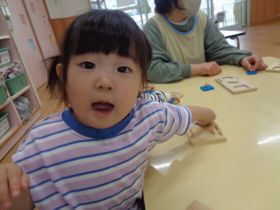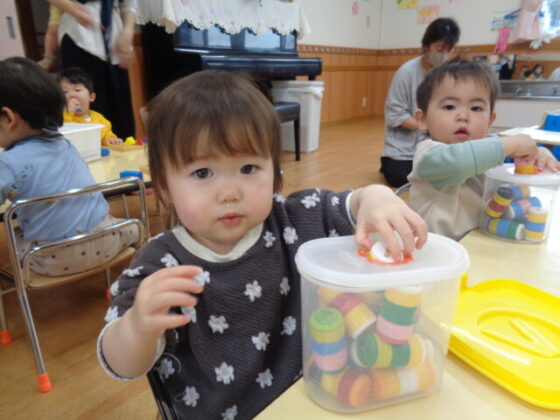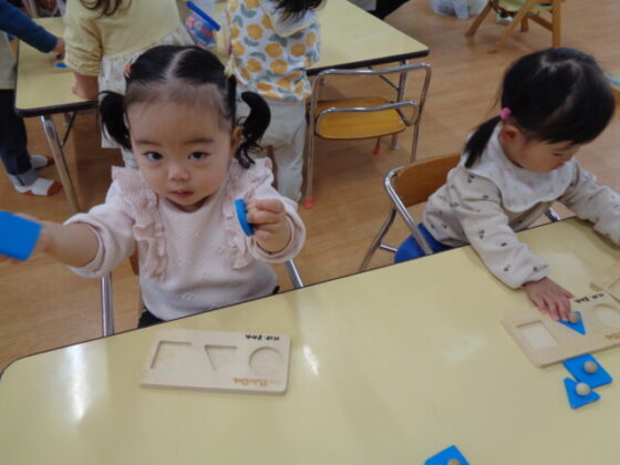 今日からさくら組での生活がスタートした子どもたち!緊張している様子の子もいれば落ち着いて過ごす子もいましたよ☺型はめパズルやポットン落としで遊びました。