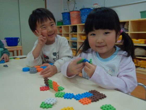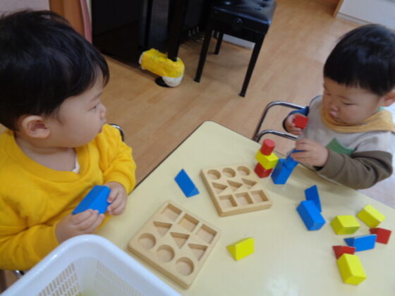 型はめパズルでは、子どもたちは丸や三角、四角などの形に苦戦しながらも、上手に形をはめることが出来ていました♪お友達と一緒に楽しむ姿も見られ、とても微笑ましかったです☆