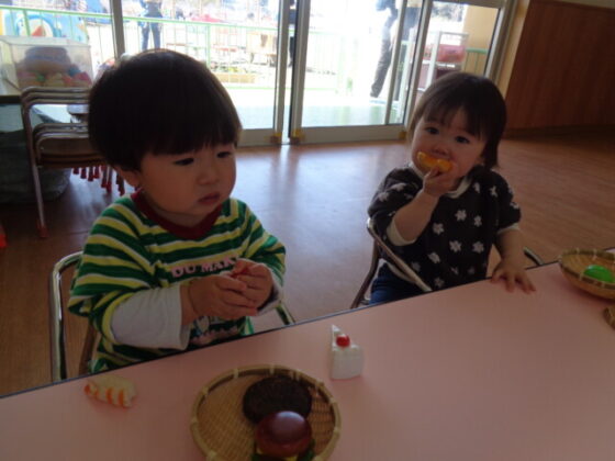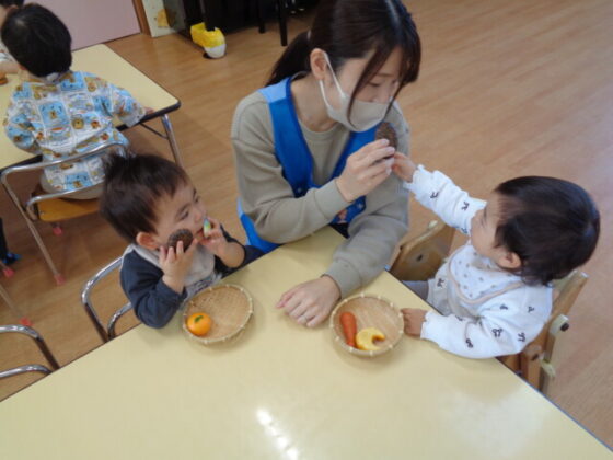 室内でおままごとをしました。好きな食べ物を手に取って食べる真似をしたり、かごに入れたり出したりして遊んでいました。高月齢の子は「ハンバーグ」「おにぎり」とお話したり、保育士に「どーぞ」と渡して楽しむ子もいました。