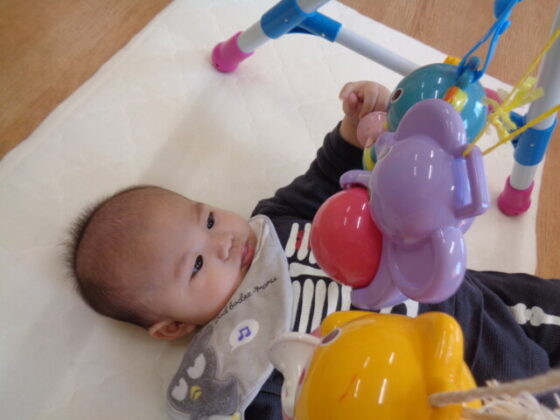 月齢の低い子は、マットに仰向けになりベビージムや寝返りの練習をしていました。
