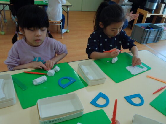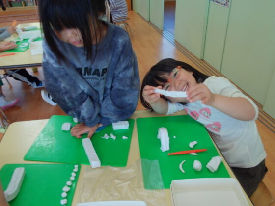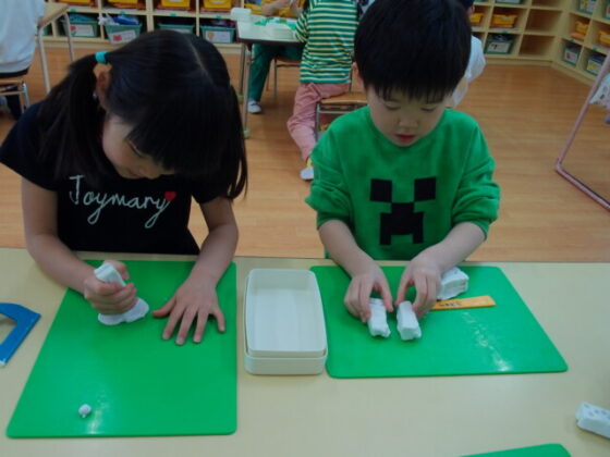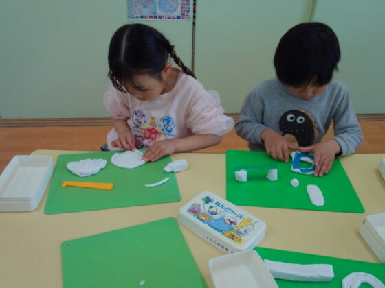 その後は、部屋に入り粘土遊びをしました。新しい粘土だったので、皆ウキウキで作り始めていました。スポンジケーキや、カップケーキ、蛇、長い紐など各自思い思いに作っていました。