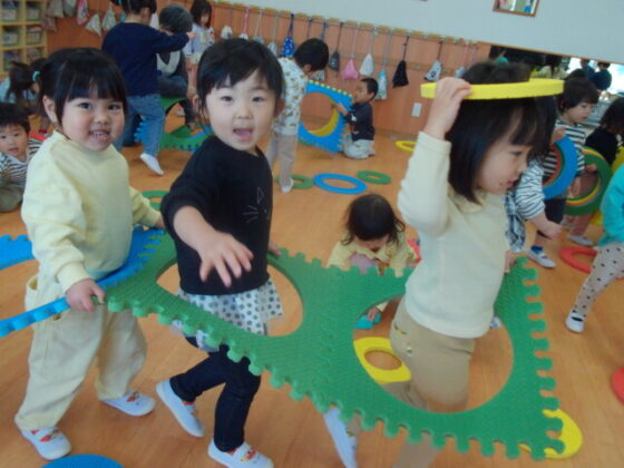 体操の後は、プラポイントで遊びました。プラポイントを繋げて電車を作りました。その中に入って電車ごっこを楽しみました。
