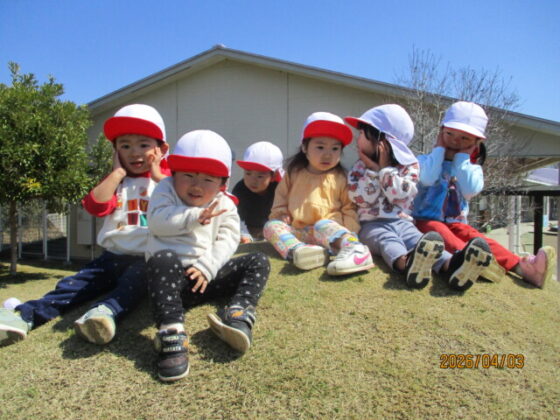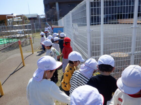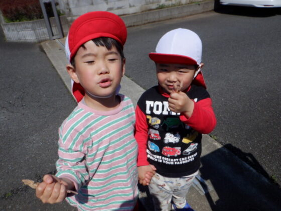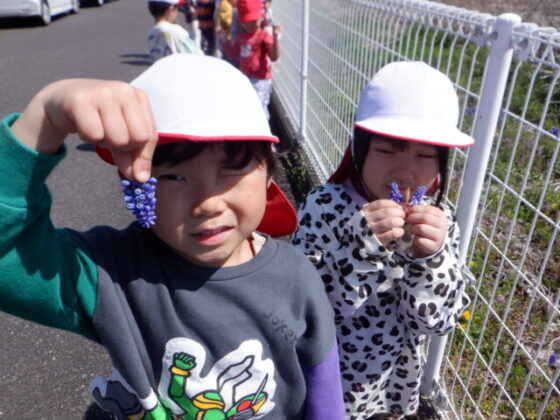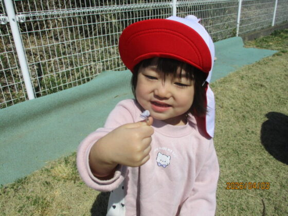園舎の裏側に行くと、紫色のお花を発見‼「ひっくり返すとぶどうみたい‼」と皆で逆さまにして見ていました♪様々な草花に触れながら、春の訪れを感じる事ができました♪