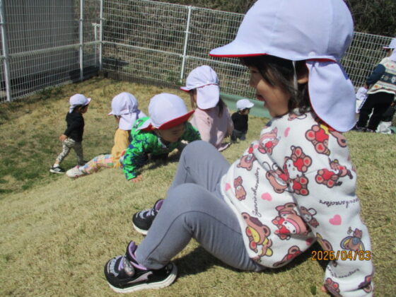 築山で遊びました。築山に着くと、嬉しそうに走り出す子どもたち♪すぐに、上まで登っては滑ってを繰り返し楽しんでいました♪