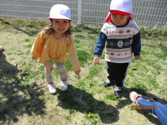 戸外に出て、園内散歩をしました。最近雨が続いたので、久しぶりの外遊びで嬉しそうな子どもたち。「今日は行ける‼やった‼」と大喜びで準備をしていました♪暖かくなってきたので、園庭にはたんぽぽやつくしなど春の草花が沢山!夢中で手に取ったり、じっくりと見たりしていました♪「かわいいね♡」と友達と見せ合ったり、、、「先生大好きだからプレゼント♡」と保育士にくれたりしました♪