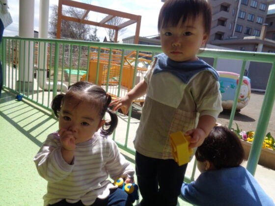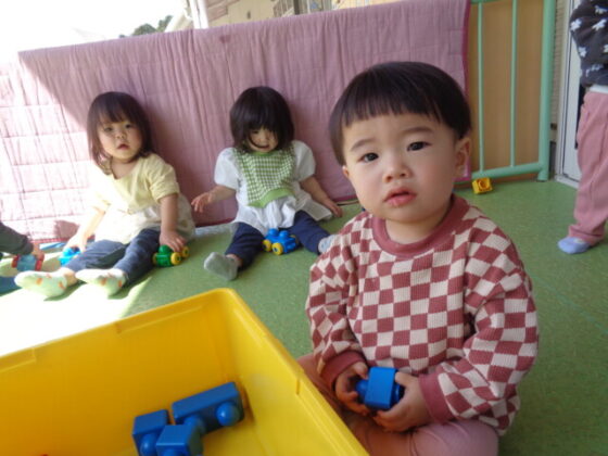 今日も気持ちの良い天気だったので、テラスに出て遊びました。大型絵本を見たり、以上児クラスのお友達が遊んでいる所を見ながらブロック遊びをしたりしました♪