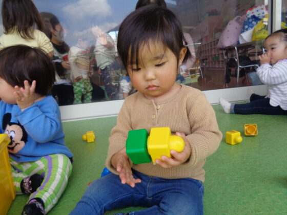 慣らし保育中の子も、外に出ると泣き止み、おんぶや保育士の膝の上で周りの様子をじっと見ていました。保育士から離れてブロックで遊べるようになった子もいました。