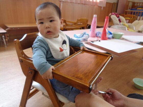 足型スタンプをしました。筆を使って足に絵の具を付けるとくすぐったいのかニコッと笑う子どもたちでした☺