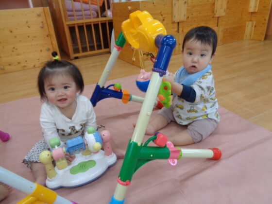 その後、遊びのスペースに移動して、ベビージムなどで遊びました♪新しく入ったお友達もニコニコ笑う事が増えてきました。