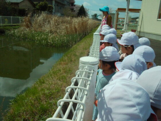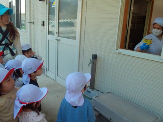 散歩では貯水池にいるアメンボに「こんにちは~」と挨拶をしたり、飛んでいるちょうちょに手を振ったりしていました。給食室の先生にも元気に挨拶が出来ました!すると、バナナのヘタを見せてくれました。「すごーい!」「包丁で切ったの?」と興味津々でしたよ☺
