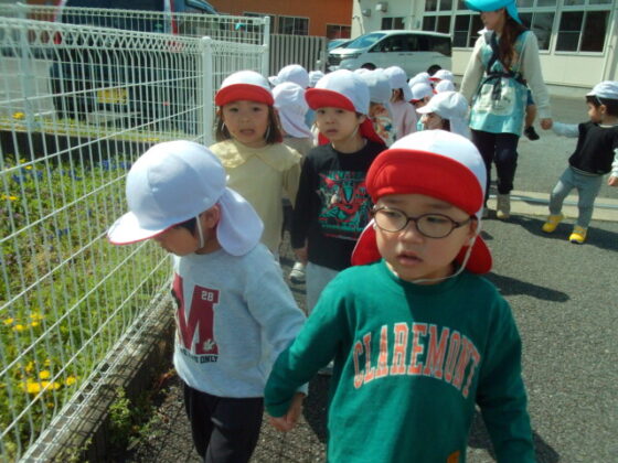 戸外に行って、園内散歩をしました。進級して初めての戸外遊びにワクワクの子どもたち…!戸外に行く準備(着替えの用意)も初めてでしたが、一生懸命頑張っていました。