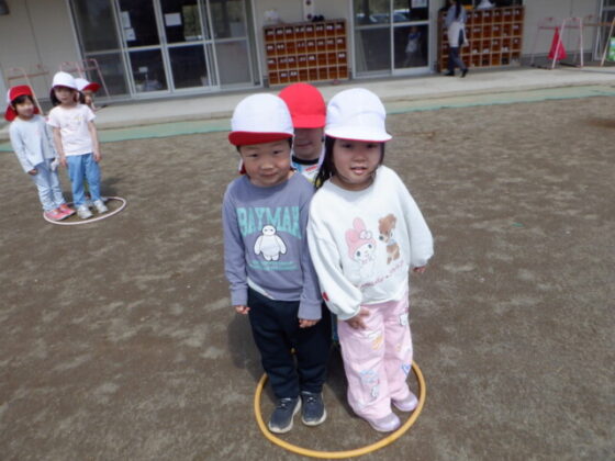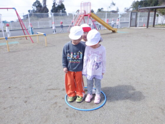 鬼にタッチをしたら、、、急いでフラフープ(家)の中に入ります‼鬼に捕まえられないようにと夢中で走っていました。無事入ることができ一安心♡