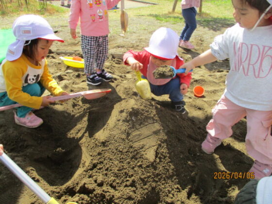大きなシャベルでは、山作りをしました。「おおきくなあれ♪」と言いながら砂をのせる姿がとても可愛らしかったです♪