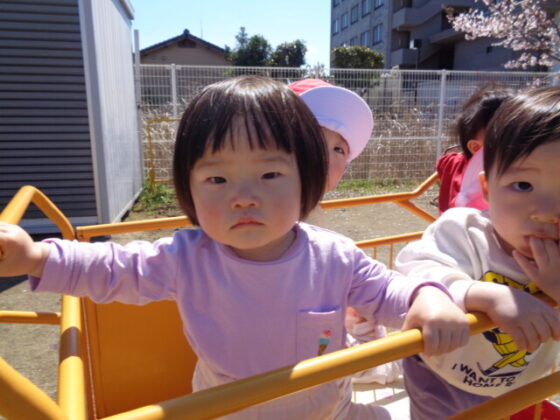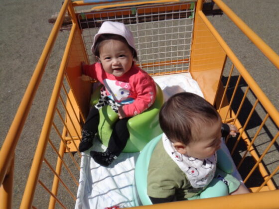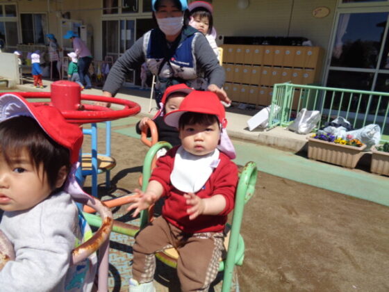 散歩車に乗って園庭を散歩しました。