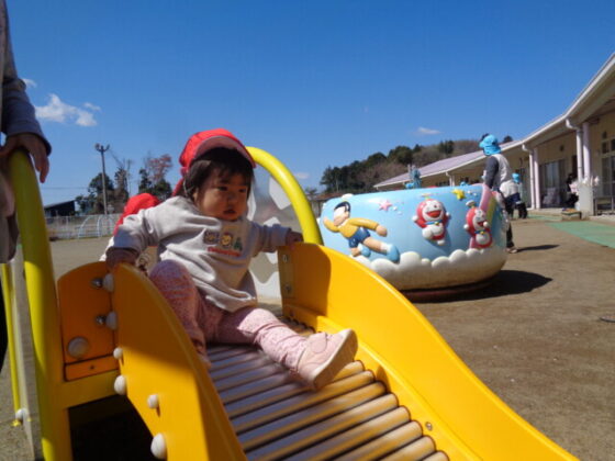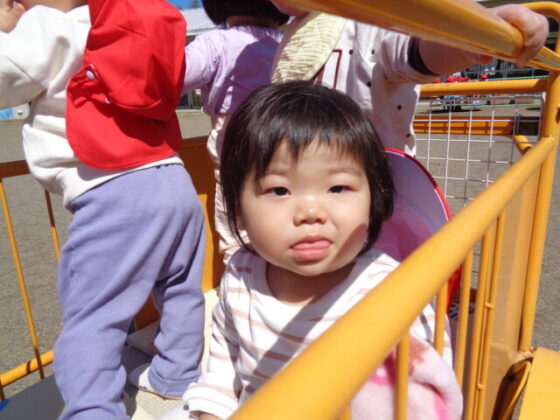 砂場やメリーゴーランド、ローラー滑り台で遊びました。砂場では、コップに砂を入れたり、近くにいる保育士に「どうぞ!」と渡したりして、やりとりを楽しむ子どもたち♪皆、夢中になって遊び過ごしました。