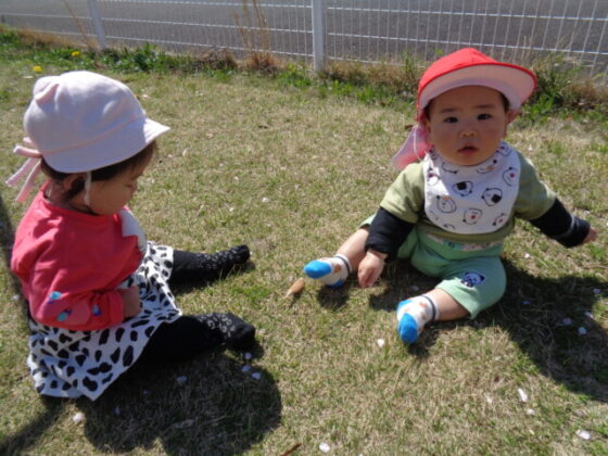 ぽかぽか陽気で気持ち良かった為、芝生におりて見ました♪草をつまんでいた子どもたちでした。