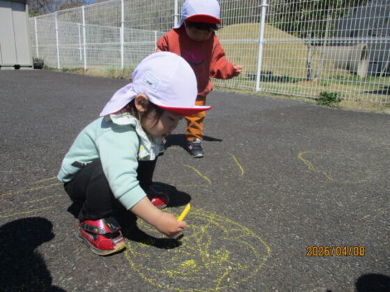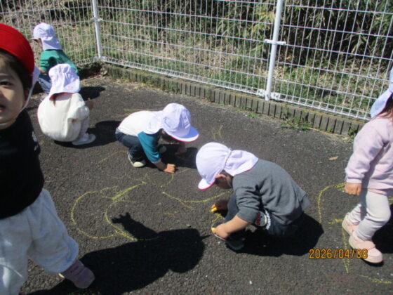 黄色のチョークを使ってなぐり描きを楽しみました♪保育士がアンパンマンや丸などの形を描くと、嬉しそうに上からなぞる子や友達と笑い合っている子がいました☺