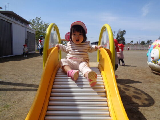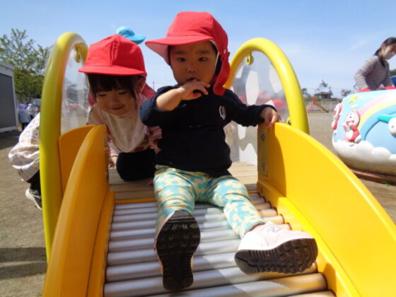 ローラー滑り台やメリーゴーランドに乗って遊びました。滑り終わると「もういっかい!」「できた」と嬉しそうにしながら、近くの保育士に伝え、繰り返し滑る姿がとても可愛らしかったです♪